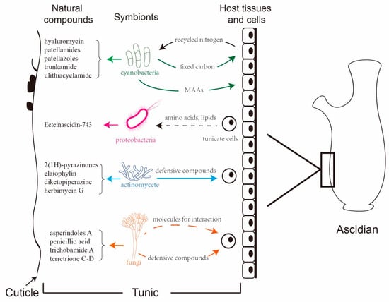 In this review, we first document the novel compounds produced by the host animals, and then we focus on the existing metabolites that have been identified from ascidian symbionts. Subsequently, we discuss the roles of these symbionts in the biosynthesis of natural products. We also summarize the diversity of microbe communities, which not only benefit the hosts but are also involved in their regulatory roles in the biosynthesis of natural products. The interactions between ascidians and their symbionts indicate the existence of some small molecules that are directly recognized by symbiotic microbes to modulate and control the production of natural compounds, which, in turn, affect the host ascidians.