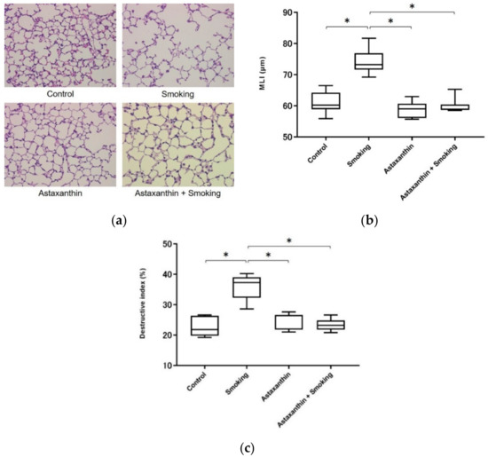 2.4. Astaxanthin Ameliorated Cigarette Smoke-Induced Emphysema