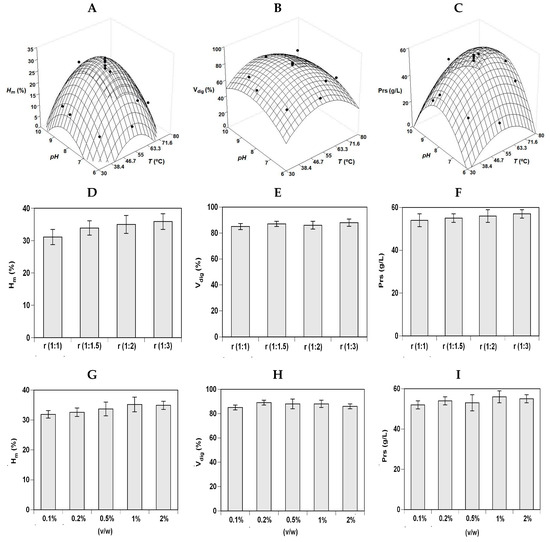 Optimization studies of S_H hydrolysis by Alcalase. Experimental data and theoretical surfaces showing the combined influence of pH and T on Hm (A), Vdig (B), and Prs (C) as defined in Table 3 and Table 4. (D) Individual influence of Alcalase concentration on Hm. (E) Individual influence of Alcalase concentration on Vdig. (F) Individual influence of Alcalase concentration on Prs. (G) Individual influence of S:L ratio on Hm. (H) Individual influence of S:L ratio on Vdig. (I) Individual influence of S:L ratio on Prs. Error bars show the intervals of confidence for n = 2 (replicates of independent hydrolysates) and α = 0.05.