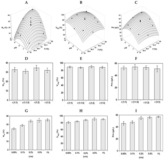Optimization studies of RT_H hydrolysis by Alcalase. Experimental data and theoretical surfaces showing the combined influence of pH and T on Hm (A), Vdig (B), and Prs (C) as defined in Table 3 and Table 4. (D) Individual influence of Alcalase concentration on Hm. (E) Individual influence of Alcalase concentration on Vdig. (F) Individual influence of Alcalase concentration on Prs. (G) Individual influence of S:L ratio on Hm. (H) Individual influence of S:L ratio on Vdig. (I) Individual influence of S:L ratio on Prs. Error bars show the intervals of confidence for n = 2 (replicates of independent hydrolysates) and α = 0.05.