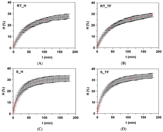 Degree of hydrolysis (H) of salmonids wastes by Alcalase: (A) RT_H: heads of rainbow trout; (B) RT_TF: trimmings and frames of rainbow trout; (C) S_H: heads of salmon, and (D) S_TF: trimmings and frames of salmon. Weibull equation (continuous line) modeled the time-course of hydrolysis degrees (symbols). Error bars show the intervals of confidence for n = 18–20 (replicates of independent hydrolysates) and α = 0.05.