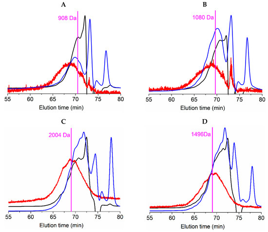Gel permeation chromatography (GPC) eluograms of fish protein hydrolysates (FPHs) (A: RT_H, B: RT_TF, C: S_H, and D: S_TF). Black line: refractive index; blue line: UV (232 nm); red line: right angle light scattering; vertical lines: number average molecular weight (Mn).