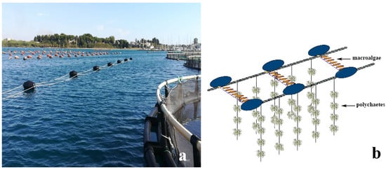 Rearing/cultivation of bioremediators in the IMTA system: (a) Fish cages of the integrated multi-trophic aquaculture (IMTA) system in the Mar Grande of Taranto and long-line system; (b) detail of the location of the bioremediators. As indicated by the arrows, the algae were horizontally arranged at 1 m depth within a typical long-line system, while polychaetes were placed vertically in polypropylene nets and placed around the fish cages.