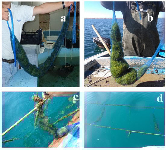 Cultivation trials of Chaetomorpha linum in the realized IMTA system: (a,b) Algae arranged in cultivation sockets; (c) C. linum located in the farm; (d) algae in net sacks hung at 1 m depth within a typical long-line system.