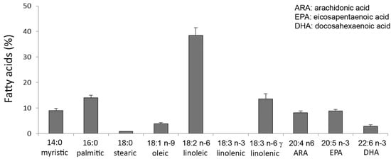 The fatty acid profile of total lipids extracted from C. linum is shown in Figure 4. Polyunsaturated fatty acids (PUFAs) were the most abundant, accounting for 71.97% of total FAs, and the most abundant PUFAs were linoleic acid (18:2 n-6), 18:3 n-6 γ linolenic acid, the n-3 eicosapentaenoic acid (EPA, 20:5 n-3), and the n-6 arachidonic acid (ARA, 20:4 n-6), and accounting for 38.46%, 14%, 8.83%, and 8.14% of total FAs, respectively (Figure 4a). The n-3 docosahexaenoic acid (DHA, 22:6 n-3) represented 2.91%. Saturated fatty acids (SFAs) represented 23.83% of total fatty acids (FAs). Palmitic acid (16:0) was the prevalent SFA (14.03% of total FAs), followed by myristic acid (14:0; 9% of total FAs). Monounsaturated fatty acids (MUFAs) showed the lowest percentage (4.2% of total FAs) and among them oleic acid (18:1 n-9) prevailed. The ratio of n-6:n-3 fatty acids was about 5.