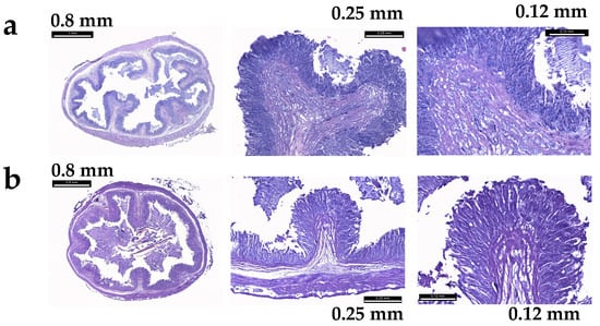 Stomach histological analyses of the fish feed with the experimental diets: (a) Fish fed with the control meal; (b) fish fed with the innovative meal.