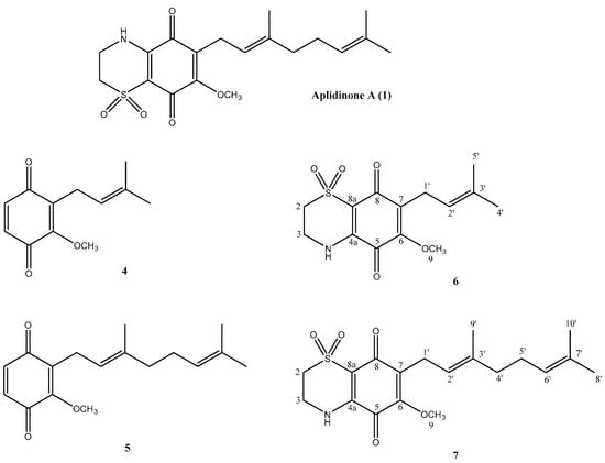 Structures of compounds 4 and 5 were easily defined similar to the spectroscopic resonances (1H and 13C NMR) of the compounds already reported in literature [20]. HRESI-MS data of compounds 6 and 7 indicated that the two compounds had the molecular formulas C14H17O5NS and C19H25O5NS, respectively. Analysis of 1D and 2D NMR spectral data of 6 and 7 (CDCl3) allowed the assignment of all 1H and 13C NMR signals (Table 1) confirming the whole structure of thiazinoquinones 6 and 7, except for the regiochemistry of the 1,1-dioxo-1,4-thiazine ring. Nevertheless, the close correlation between the experimental NMR signals of bicyclic skeleton of compounds 6 and 7 with 13C chemical shift values previously calculated by theoretical means [14,19] for strictly correlated structures was in agreement with the regiochemistry depicted in Figure 1.
