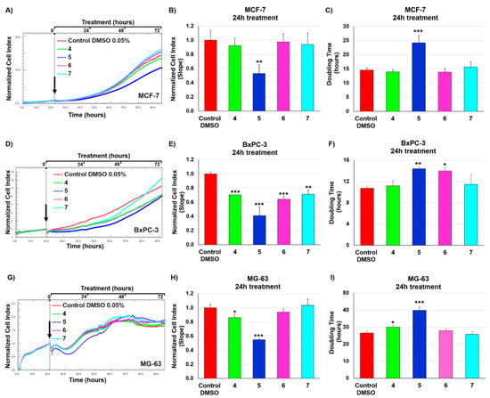 Bx-PC3 cells experienced delayed proliferation after exposure to compounds 4, 6, and 7, which were shown to elicit a significant, moderate reduction (approximately 30%) in the slope of the growth curve as compared to the control. On the other hand, MCF-7 and MG-63 cell growth was basically unaffected or slightly delayed after treatment with 4, 6, and 7 (Figure 2A–C,G–I). Notably, compound 5 exerted the highest antiproliferative effect and exhibited a comparable toxicity in all three cell lines, as inducing a substantial decrease of cell index (within the range of 50–60%) and a significant increase in cell doubling time.