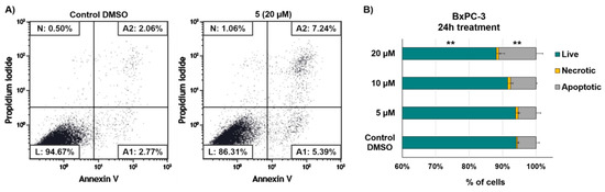 After treatment with different concentrations (5, 10, and 20 µM) of compound 5, BxPC-3 cells were stained with annexin-V-fluorescein isothiocyanate (FITC) and propidium iodide, using the FITC Annexin V Apoptosis Detection kit I (Becton Dickinson, BD, Franklin, NJ, USA) for flow cytometric detection of apoptotic and necrotic cells. Samples were prepared according to manufacturer’s protocol and three independent experiments were carried out.