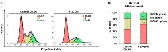 Cell cycle analysis through PI staining and flow cytometry of BxPC-3 cells after 24 h treatment with 20 µM compound 5 and DMSO vehicle. (A) Cell cycle histogram plots show a single representative experiment. (B) Changes in cell cycle distribution of BxPC-3 cells treated with quinone 5 (20 µM) for 24 h. Data are presented as mean ± SD; n = 4. Statistical significances are referred to the DMSO control. ** p < 0.01, *** p < 0.0001.
