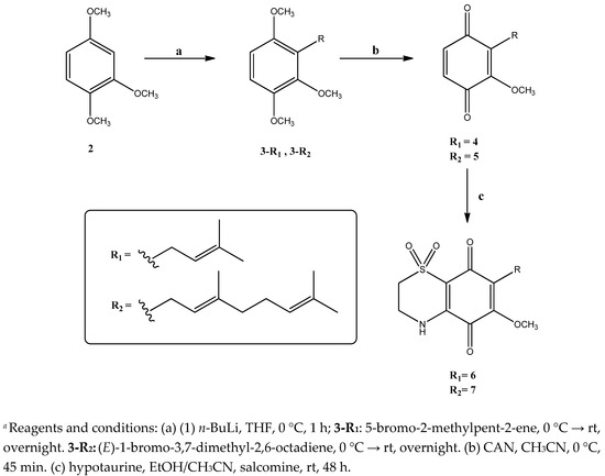 In detail, as reported in Scheme 1, the commercially available 1,2,4-trimethoxybenzene (2) has been chosen as the starting material. In the first step, compound 2 was treated with n-BuLi in THF solution; 5-bromo-2-methylpent-2-ene or (E)-1-bromo-3,7-dimethyl-2,6-octadiene were then added, keeping the relevant mixtures at room temperature overnight. Under these conditions, the monoalkylated products, compounds 3-R1 and 3-R2, were obtained with very high yield, following that the introduction of the alkyl residue on 1,2,4-trimethoxy benzene resulted highly selective in the 3-position. Subsequently, each compound 3-R1 and 3-R2 was subjected to an oxidation reaction with cerium ammonium nitrate (CAN) providing the quinones 4 (83%) and 5 (76%), respectively. Previously reported attempts to produce selectively 3-monoprenylated quinones afforded mixtures of monoprenylated compounds together with polyprenylated products [20]. Compound 5 itself had been previously obtained through this different synthetic pathway with an overall low yield (≈ 45%). Our procedure afforded monoprenylated quinone 5 with a total yield of 74%, thus resulting in a great improvement over previous synthesis, and the absence of side products, especially of monoalkylated quinones in different position. Afterwards, the thiazinoquinone-bicyclic system of 6 and 7 was built up by condensation of the quinone ring of compounds 4 and 5 with hypotaurine using salcomine as catalyst. Contrary to what previously occurred during the formation of thiazinoquinone scaffold in other unsymmetrical methoxy-quinones [16,17,18,19], the addition of hypotaurine to prenylbenzoquinones 4 and 5 led to the formation of only one of the two possible regioisomers (Scheme 1). This highly regioselective outcome could be explained by considering the greater steric hindrance of the prenylated side chains of compounds 4 and 5 when compared to other quinones featuring smaller and/or less flexible side chains [16,17,18,19].