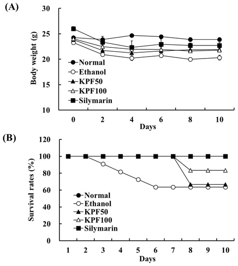 The body weight of the mice was monitored every two days during the experimental period. The changes in body weight in the mice are shown in Figure 1A. The final body weight gain in the ethanol group (20.33 ± 0.45 g) was significantly lower than that of the normal group (23.91 ± 0.35 g). The body weight gain in the KPF (50 and 100 mg/kg mice) groups was 21.92 ± 0.22 g and 21.77 ± 0.06 g, respectively. The survival rates of the experimental mice were monitored daily. As shown in Figure 1B, the survival rate in the control and silymarin groups was 100% during the trial period, whereas the survival rate in the ethanol group was 63.6%. In the case of the KPF (50 and 100 mg/kg mice) groups, the survival rate was 66.7% and 83.3%, respectively.