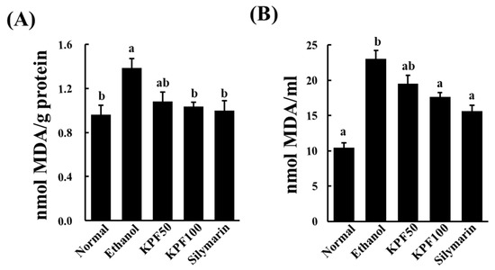 MDA levels in liver homogenates and serum were examined to evaluate the protective effect of KPF against lipid peroxidation. The MDA level in the liver homogenates of the ethanol (only)-treated group drastically increased compared to the control group, while MDA levels were significantly decreased in the KPF and silymarin-treated groups (Figure 2A). A similar trend was seen for the serum MDA levels (Figure 2B).