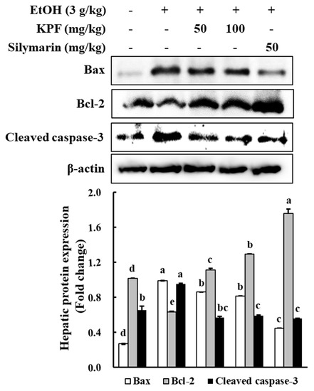 Effects of KPF on apoptosis-related protein expressions. Expression levels of cleaved caspase-3, Bcl-2, and Bax proteins in the liver tissue were analyzed by western blot analysis. Values: mean ± SE of three determinations (n = 6). Bars with different letters are significantly different (p < 0.05).