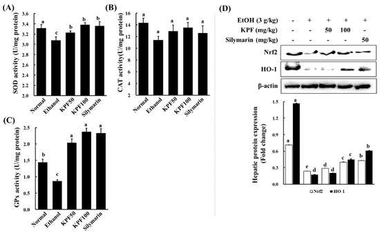 Effects of KPF on antioxidant enzyme levels in ethanol-induced mice. Determination of antioxidant enzyme activities (A) superoxide dismutase (SOD), (B) catalase (CAT) and (C) Glutathione peroxidase (GPx) in liver homogenates. (D) Effects of KPF on the hepatic levels of Nrf2 and HO-1 protein expression. Values: mean ± SE of three determinations (n = 6). Bars with different letters are significantly different (p < 0.05).