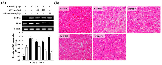 Effect of KPF on the hepatic levels of inflammatory cytokines in alcohol-induced mice. (A) RT-PCR analysis for mRNA levels of hepatic inflammatory cytokines. (B) Histopathological changes of mouse liver. Values: mean ± SE of three determinations (n = 6). Bars with different letters are significantly different (p < 0.05).