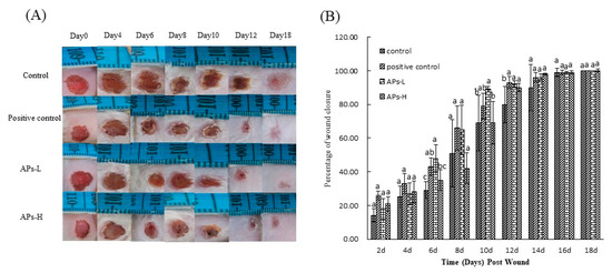 Skin wound healing over time in mice treated with Pinctada martensii active peptides (APs). (A) Representative photographs of the wounds in excision wound model. (B) Percentage of wound closure obtained on days 2, 4, 6, 8, 10, 12, 16 and 18 from vehicle or APs treated mice. Values are expressed as mean ± SD, n = 4. Note: Different superscript letters on the same day indicate significant differences between the groups (p < 0.05) and insignificant differences (p > 0.05), respectively.
