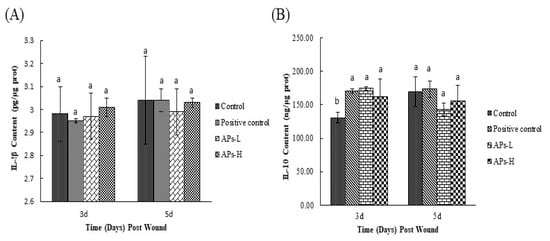 Effect of Pinctada martensii APs on cytokines in wound skin tissue. (A) Effect of APs-L and APs-H on the expression of IL-1β. (B) Effect of APs-L and APs-H on the expression of IL-10. Note: Different superscript letters on the same day indicate significant differences between the groups (p < 0.05) and insignificant differences (p > 0.05), respectively.