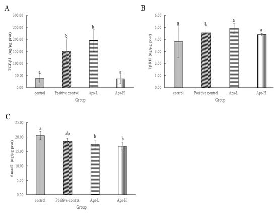 To investigate the mechanism of action of APs on TGF-β/Smad signaling pathway, we further identified APs for transforming growth factor-β1 (TGF-β1), transforming growth factor-β receptor II (TβRII) and Smad7 in the TGF-β/Smad signaling pathway. As shown in Figure 3A, the content of TGF-β1 in the positive control and the APs-L groups was significantly higher than that in the other groups (p < 0.05). Figure 3B shows that the levels of TβRII in APs-L and APs-H were 4.91 ng/μg protein and 4.41 ng/μg protein, which was not significantly different from the negative control group (3.83 ng/μg prot) (p > 0.05). However, Aps-L and Aps-H increased the expression of TβRII compared to the negative control group. From Figure 3C, the Smad7 content of the APs-L and APs-H groups was significantly lower than that of the negative control group (p < 0.05).