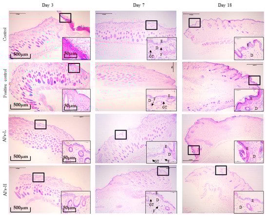 H&E stain histological analysis of mouse wounds treated with Pinctada martensii APs (4× magnification). Note: The black bold frame indicates the wound site, and the picture at the bottom corner of the picture shows a magnified image of the wound (40×). On the third day, black arrows indicate inflammatory cell infiltration. The letters D, E, F, and GT represent the dermis layer, the epidermal layer, fibroblasts, and granulation tissue, respectively.