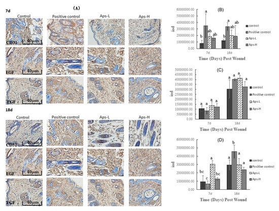 As shown in Figure 5, on days 7 and 18, there was no significant difference in the effects of APs-L and APs-H on CD31 and FGF compared with the positive control group (p > 0.05), but the expression level was higher than that of the negative control group. On day 7, compared with the negative control group, the APs-L group of mice significantly had promoted production of EGF (p < 0.05); on the 18th day, the positive control group significantly promoted the production of EGF (p < 0.05), and there was no significant difference in the other experimental groups. Therefore, APs promoted the expression of CD31, FGF, and EGF compared with the control group.