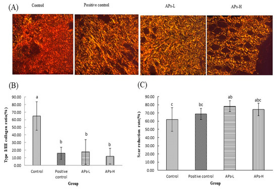 In this experiment, a polarized light microscope was used. Under the microscope, the type I collagen fiber was yellowish red, and the type III fiber was green. Figure 6A shows a large number of tightly arranged collagen fibers in the APs administration groups, showing a strong birefringence, a yellow or red type I fiber; showing a weak birefringence and a green type III fiber. As can be seen in Figure 6B, the collagen I/III ratio in the administration groups was small, and the difference was significant (p < 0.05). The scar reduction rate of mice at 18 days after wounding is as shown in Figure 6C. The scar reduction rate of the APs-L group was significantly higher than that of the negative control group (p < 0.05).