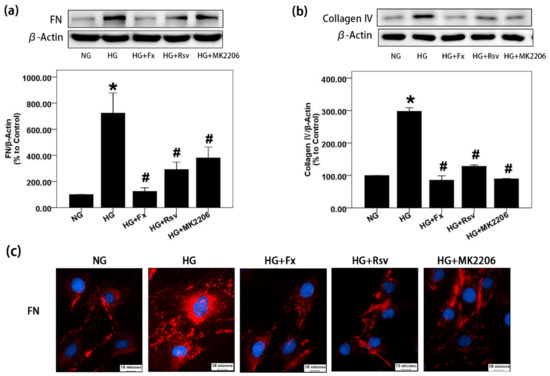 Fx can significantly reduce the accumulation of FN and collagen IV induced by HG in GMCs. (a) FN was detected by western blot after 24 h of HG treatment with or without Fx (2 μM), Rsv (40 μM) or MK2206 (2 μM). (b) After 24 h of HG treatment with or without Fx (2 μM), Rsv (40 μM) or MK2206 (2 μM), GMCs were lysed for protein extraction, and collagen IV was detected by western blot. (c) GMCs were induced by HG with or without Fx (2 μM), Rsv (40 μM), or MK2206 (2 μM) for 24 h. FN was stained by the immunofluorescence with antibody against FN and then captured under Olympus IX71 (400X); red fluorescence indicates FN, blue fluorescence indicates nucleus, and scale represents 10 μm. β-Actin was measured as a loading control; all the experiments were repeated at least three times independently with similar results. * p < 0.05 vs. normal glucose (NG) group and # p < 0.05 vs. 30 mM HG group.