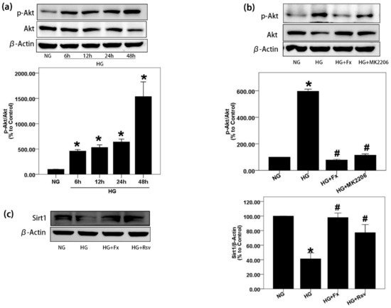Fx reverses the activation of Akt and the inhibition of Sirt1 induced by HG. (a) GMCs were treated with HG for indicated times and protein was extracted for p-Akt (S473) detection by western blot. (b) GMCs were treated with HG with or without Fx (2 μM) or MK2206 (2 μM) respectively for 24 h, and protein was extracted for p-Akt (S473) and Akt detection by western blot. (c) After treated with HG with or without Fx (2 μM) or Rsv (40 μM) respectively for 24 h, GMCs were lysed and protein was extracted for Sirt1 quantification by western blot. β-Actin were measured as the loading control; experiments were repeated at least three times with similar results. * p < 0.05 vs. NG group and # p < 0.05 vs. HG group.