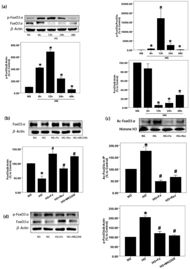 Fx reverses the lower expression of FoxO3α in GMCs induced by HG. (a) GMCs were treated by HG for indicated times, and cells were lysed to extract protein for the detection of FoxO3α and p-FoxO3α (S253) by western blot. (b,d) GMCs were treated by HG combined with or without Fx (2 μM), Rsv (40 μM), or MK2206 (2 μM) for 24 h, then protein was extracted for the detection of FoxO3α and p-FoxO3α (S253) by western blot. (c) GMCs were treated as previous and nuclear protein was obtained. Total FoxO3α was precipitated by incubating with antibody against FoxO3α over the night under 4 °C, and acetylated FoxO3α were displayed by pan acetylation antibody. Histone H3 and β-actin were measured as the loading control, experiments were repeated at least three times with similar results. * p < 0.05 vs NG group and # p < 0.05 vs 30 mM HG group.