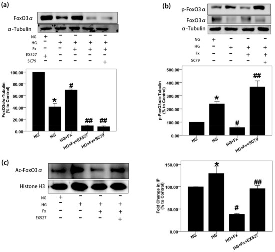 Fx regulates FoxO3α through Akt and Sirt1 signaling in GMCs. (a,b) GMCs were treated with NG (5.6 mM), HG (30 mM), HG combined with Fx (2 μM), HG combined with Fx (2 μM) and EX527 (1 μM), or HG combined with Fx (2 μM) and SC79 (20 μM), respectively, for 24 h. Protein was obtained, and western blot was performed to detect FoxO3α and p-FoxO3α (S253). (c) GMCs were treated as previously, and nuclear protein was extracted for immunoprecipitation. The lysis supernatant was quantified by BCA assay and packed equally. Total FoxO3α was precipitated by incubating with an equal FoxO3α antibody and performed the resuspension and centrifugation processes for five times after that. Mixture of protein and loading buffer were boiled for 5 min, and then, a process similar to western blot experiment was performed for the acetylated FoxO3α detection with pan acetylation antibody. α-Tubulin and histone H3 were measured as the loading control; experiments were repeated three times with similar results. * p < 0.05 vs. NG group, # p < 0.05 vs. 30 mM HG group, ## p < 0.05 vs. HG+Fx group.