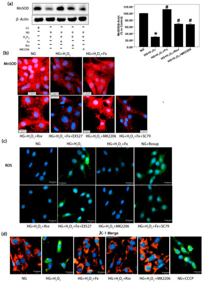 Fx alleviates oxidative stress of GMCs cultured in HG through Akt/Sirt1/FoxO3α signaling. (a) After 24 h serum-free medium treated, the GMCs were induced with 150 μM hydrogen peroxide-contained HG, combined with or without Fx (2 μM), Rsv (40 μM), or MK2206 (2 μM), respectively, for 24 h. Then protein was extracted, and MnSOD was detected by western blot; β-actin was measured as the loading control, and experiments were repeated three times with similar results. * p < 0.05 vs. NG group, and # p < 0.05 vs. HG group. (b) The GMCs were treated with 150 μM hydrogen peroxide-contained HG combined with or without Fx (2 μM), Rsv(40 μM), MK2206 (2 μM), Fx (2 μM) combined with EX527 (1 μM), or Fx (2 μM) combined with SC79(20 μM), respectively, for 24 h, and MnSOD was detected by immunofluorescence method under Olympus IX71. Red fluorescence represents MnSOD, and blue fluorescence represents the nucleus; scale bar represents 10 um (400X). (c) The GMCs were induced oxidative stress with 150 μM hydrogen peroxide-contained HG combined with or without drug administration as previously, for 24 h. Rosup (10 μM) was used as a positive reagent to induce ROS for 30 min. ROS was stained with DCFH-DA for 30 min under dark condition and latter captured under Olympus IX71. Green fluorescence represents ROS; blue fluorescence represents the nucleus; and the scale represents 10 μm (400X). (d) GMCs were treated as previously and then incubated in the incubator with JC-1 for 30 min. Mitochondrial membrane potential was captured under Olympus IX71. Blue fluorescence represents the nucleus; green fluorescence represents JC-1 monomer; red fluorescence represents JC-1 aggregate, and the scale represents 10 μm (400 X).