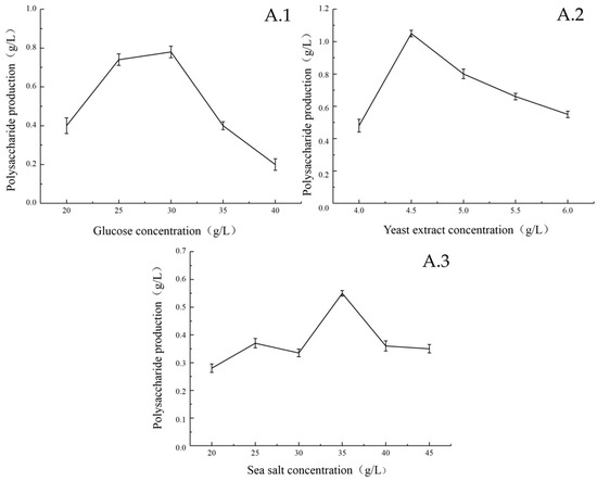 Effects of glucose concentration (A.1), yeast extract concentration (A.2) and sea salt concentration (A.3) on EPS Yield in Medium. Effect of glucose concentration: Sea salt concentration 35 g/L, Yeast extract concentration 4.5 g/L, Temperature 25 °C, Fermentation time 35 h, Seed volume 10%, Shaker speed 230 rpm. Effect of sea salt concentration: glucose concentration 30 g/L, Yeast extract concentration 4.5 g/L, other conditions are the same as above. Effect of yeast extract concentration: glucose concentration 30 g/L, sea salt concentration 35 g/L. Other conditions are the same as above.