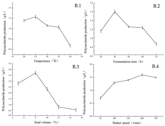 Based on the optimal medium composition of the above experiment (Sea salt concentration 35 g/L, yeast extract concentration 4.5 g/L, glucose concentration 30 g/L), the optimal temperature (B.1), fermentation time (B.2), seed volume (B.3), and shaker speed (B.4) are further studied.
