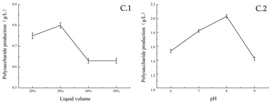 Effect of different liquid volume (C.1) and pH (C.2) on polysaccharide yield at 25 °C.