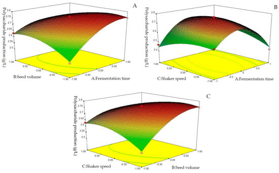 Response surface diagram of two-factor interaction: (A) correspondence between the interaction of seed volume and fermentation time; (B) correspondence between the interaction of shaker speed and fermentation time; (C) correspondence between the interaction of Shaker speed and seed volume.