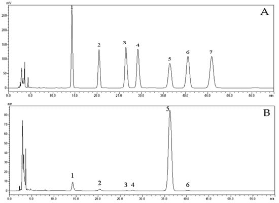 HPLC chromatograms of seven PMP-labeled standard monosaccharides (A) and PMP-labeled monosaccharides released from EPS (B). Peaks: 1. d-Mannose; 2. d-Rhamnose; 3. d-Glucuronic acid; 4. d-Galacturonic acid; 5. d-Glucose; 6. d-Galactose; 7. d-Xylose.