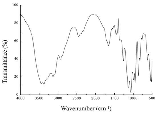 FT-IR spectroscopy is a widely used method that represents absorption of infrared light by molecular bonds at a given wavelength [18]. This method can be used to analyze the molecular structure, glycosidic bonds, and functional groups, as well as other polysaccharide structures by studying the vibration of the molecule and the polar bond between the atoms [19,20,21]. As shown in Figure 7, the EPS has an absorption peak peculiar to polysaccharide in the range of 4000 cm−1 to 400 cm−1, a strong and wide stretching vibration peak in the range of 3500 cm−1 and 3300 cm−1, which is caused by the intermolecular or intramolecular hydrogen bond formed by –OH on EPS, and a –CH2 asymmetric stretching vibration peak of C–H in 2293.73 cm−1. There is a stretching vibration peak of C=O at 1682.64 cm−1. This characteristic absorption peak may be caused by the acidic polysaccharides. An asymmetric stretching vibration of CO is in 1136.07 cm−1, which may be the characteristic absorption peak of pyranose ring. The peak in 864.11 cm−1 may be the C–H angular vibration of β-pyranose ring. This characteristic absorption peak confirms the existence of α-d-mannopyranose [22,23]. The results of monosaccharide composition were confirmed by the structure of infrared spectroscopy.
