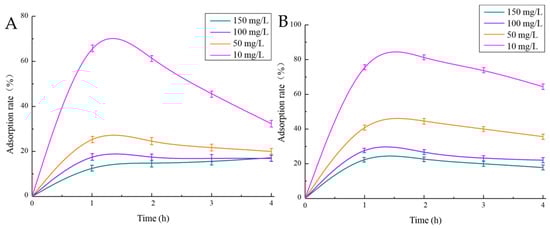 Adsorption rate of EPS for different concentrations of Cu2+ (A) and Pb2+ (B).