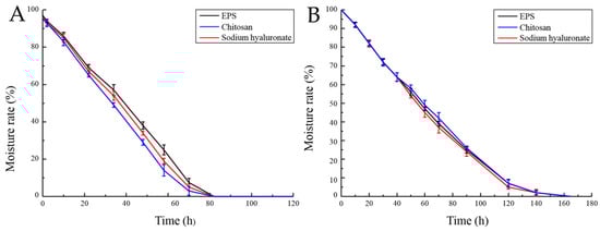 Moisturizing curve under silica gel environment (A) and 32% relative humidity (B). Moisture retention of EPS was determined by measuring the reserved weight of H2O by EPS. Chitosan and sodium hyaluronate were used as controls. The value at the beginning was set 100%.