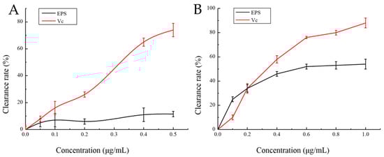 The scavenging effect of EPS on hydroxyl (A) and superoxide anions (B). The scavenging activities of different concentrations of EPS on –OH and O2− were determined by removing –OH from FeSO4 and H2O2 and O2− from pyrogallol removal. Vitamin C was used as a control and the activity of 100 µg/mL Vitamin C was set 100%.