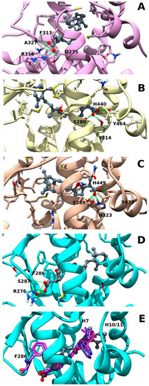 Representative frames from molecular dynamics (MD) of Muq-nuclear receptor (NR) complexes. (A) Muq-RXRα; (B) Muq-PPARα; (C) Muq-PPARγ; (D) Muq-RARα; (E) best fit between Muq-RARα MD frame (protein and Muq shown) and experimental structures of RARα in complex with agonists (only ligands shown: PDB ID: 3KMR, magenta; 3A9E, purple; 1DKF, blue). Ball and stick and stick-only representations are used for ligand heavy atoms and protein sidechain atoms within 5 Å from ligand, respectively. Carbon atoms are painted according to ribbons for proteins and dark gray for Muq, Hydrogen, nitrogen, oxygen, and sulfur atoms are painted white, blue, red, and yellow, respectively. A “green spring” representation is adopted for H-bonds involving ligand atoms.