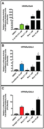 Luciferase assays. (A) Muq acts as an agonist on hRXRα-LBD. Relative luciferase activity in response to 0.1, 1, and 10 µM of Muq. 9-cis-retinoic acid at 0.01 µM was used as an RXRα agonist positive control. (B) Muq acts as an agonist on hPPARα-LBD. Relative luciferase units in response to 0.1, 1, and 10 µM of Muq. Fenofibrate at 10 µM was used as an hPPARα agonist positive control. (C) Muq acts as an agonist on hPPARγ-LBD. Relative luciferase units in response to 0.1, 1, and 10 µM of Muq. Rosiglitazone at 0.01 µM was used as an hPPARγ agonist positive control. The activity of the vehicle control was set at 1 and the relative luciferase activity obtained for each control and concentrations tested are presented as a fold induction with respect to the vehicle control. Statistical analysis was performed by comparing each concentration of Muq and of the specific agonist to the vehicle control using the Student’s t-test. The analyses were performed using GraphPad Prism 7 software. Statistically significant differences were accepted when the p-value was at least ≤0.05. Data are expressed as means ± SEM, (n = 3). * p ≤ 0.05.