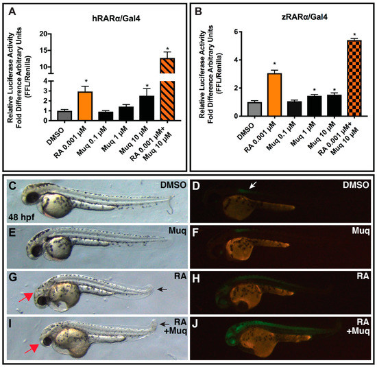 Muq synergistically reinforces (A) human RARα in vitro and (B) zebrafish RARα in vitro. Relative luciferase units in response to 0.1, 1, and 10 µM of Muq. Retinoic acid (RA) at 0.001 µM was used as an hRARα and a zRARα agonist positive control. The activity of the vehicle control was set at 1 and the relative luciferase activities obtained for each control and concentration tested are presented as a fold induction with respect to the vehicle control. Statistical analysis was performed by comparing each concentration of Muq and that of RA to the vehicle control using the Student’s t-test. The analyses were performed using GraphPad Prism 7 software. Statistically significant differences were accepted when the p-value was at least ≤0.05. Data are expressed as means ± SEM, (n = 9) for human RARα and (n = 3) for zebrafish RARα. * p ≤ 0.05. (C) Muq behaves as a weak RARα agonist and enhances RA signaling in zebrafish. Embryos carrying the 12XRARE-ef1a:EGFP transgene at 48 hpf that were treated from 24 hpf with (C,D) DMSO, (E,F) 10 μM Muq, (G,H) 0.5 μM RA, and (I,J) 0.5 μM RA + 10 μM Muq. Embryos in C, E, G, and I are the same as D, F, H, and J. Red arrows in G and I indicate smaller eyes. Black arrows in G and I indicate shortened tail. White arrow indicates E-GFP from the transgene in the anterior spinal cord. For this study, 25 embryos per condition were examined.