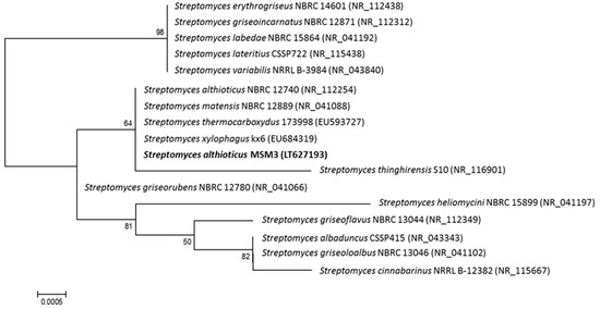 Neighbor-joining phylogenetic tree obtained by distance matrix analysis of 16S rDNA sequences, showing Streptomyces althioticus MSM3 position and its most closely related phylogenetic neighbors. Numbers on branch nodes are bootstrap values (1000 re-samplings; only values >50% are given). Bar indicates 0.05% sequence divergence.