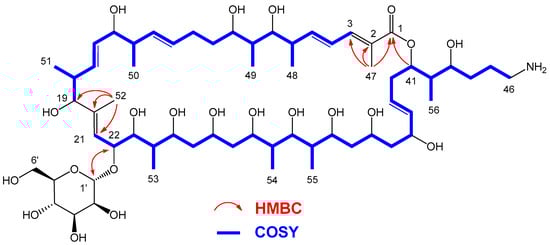 A molecular formula of C62H109NO21 was assigned to desertomycin G, according to a protonated ion observed at m/z 1204.7609 in its ESI-TOF spectrum (calcd. for C62H110NO21+ 1204.7565, ∆ 3.6 ppm). Analysis of its 1H, 13C (Table 1) and HSQC spectra revealed the presence in the molecule of 10 olefinic protons, 19 oxygenated methines, one doubly oxygenated methine, probably belonging to the anomeric position of a sugar residue, one oxygenated methylene, 8 aliphatic methines, 9 aliphatic and one nitrogenated methylenes and 10 aliphatic methyl groups, suggesting a polyketidic nature for the compound. Correlations observed in the COSY spectrum allowed us to establish the sequences from C-3 to C-19 and from C-21 to C-46 and also confirmed the attachment of methyl groups C-48, C-49, C-50, C-51, C-53, C-54, C-55 and C-56 to C-6, C-8, C-14, C-18, C-24, C-30, C-32 and C-42, respectively (Figure 2). On the other hand, HMBC correlations between H3-47 to C-1, C-2 and C-3, and H3-52 to C-19, C-20 and C-21 allowed completion of the linear sequence from C-1 to C-46. An additional HMBC correlation between H-41 and C-1 and the deshielded oxygenated proton H-41 (5.11 ppm) was also indicative of the existence of a lactone ring between C-41 and C-1 (Figure 2). Finally, the only nitrogen atom present in the molecule was associated with the presence of a primary amine group at C-46, as evidenced by the corresponding 1H and 13C NMR chemical shifts at this terminal position (δH 2.93 ppm and δc 40.8 ppm). A bibliographic search established that the planar structure of this macrocyclic moiety of the molecule was very similar to that found in desertomycin A, the two major differences between both molecules being the presence of an additional double bond at ∆4 and an additional methyl group (C-53), located at C-24 in the structure of desertomycin G. The E configuration of the ∆4 double bond was proposed based on the large JH4-H5 coupling constant measured (15.0 Hz). The remaining signals not yet assigned in the NMR spectra corresponded to one doubly oxygenated methine group, four oxygenated methines and one oxygenated methylene (C-1′ to -C-6′). These signals were in agreement with the presence in the molecule of an hexopyranose, identified as α-d-mannopyranose based on similar chemical shifts to those measured in the structure of desertomycin A [23]. Additionally, HMBC correlations from H-1′ to C-22 and from H-22 to C-1′ (Figure 2) confirmed the linkage of this sugar moiety to carbon C-22.