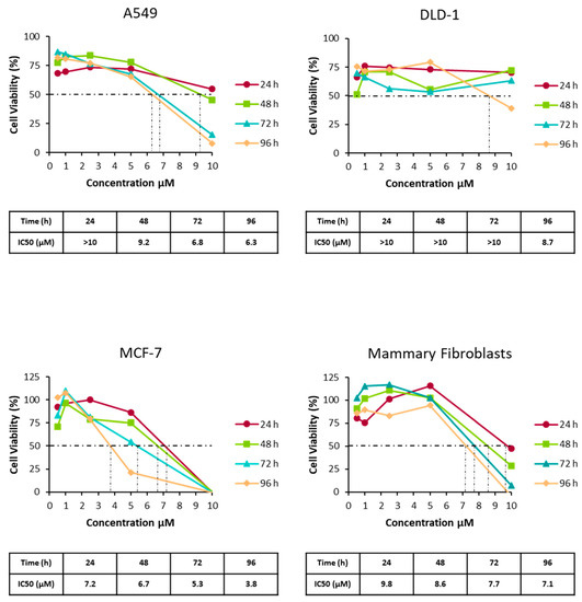 Cell proliferation was measured using the CellTiter 96 Non-radioactive Cell Proliferation Assay kit purchased from Promega Promega Biotech Iberica, Alcobendas, Spain). To this end, 103 cells were seeded in 96-well plates and six replicates per condition and time point were assessed. Cell proliferation rates were determined for five consecutive days using an automated microtiter plate reader Power Wave WS (BioTek, Bad Friedrichshall, Germany)). The conditions studied were A549, DLD-1, MCF-7 cancer cells, and healthy mammary fibroblasts in the presence or absence of different concentrations of desertomycin G.