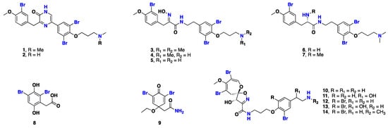 From Figure 1—seven cytotoxic bromotyrosine alkaloids, namely ma’edamines A and B (1 and 2) that possess a unique 2(1H) pyrazinone motif, along with aplysamine-2 (3), purpureamines H and I (4 and 5), and suberedamines A and B (6 and 7) were isolated from an Okinawan Suberea sp. []. Biosynthetically, 6 and 7, which are precursors of 1 and 2, could be formed by the condensation of two bromotyrosine units. Compounds 1 and 2 displayed in vitro cytotoxicity against murine leukemia L1210 and KB (mouth epidermoid carcinoma) cells, with IC50 values of 4.3, 3.9, 5.2 and 4.5 µg/mL, respectively. Furthermore, these compounds also exhibited inhibitory activity against c-erbB-2 kinase, with IC50 values of 6.7 and >10 µg/mL, respectively. Similarly, 6 and 7 exhibited in vitro cytotoxicity against murine leukemia L1201, with IC50 values of 8.0 and 8.6 μg/mL, and also against epidermoid carcinoma KB cells, with IC50 values of 9.0 and >10.0 μg/mL, respectively. Compounds 6 and 7 also showed antibacterial activity against Micrococcus luteus, with an MIC value of 12.6 µg/mL [,]. Furthermore, simple bromotyrosine derivatives isolated from Suberea sp., including subereaphenol K (8) and 2-(3,5-dibromo-1-ethoxy-4-oxocyclohexa-2,5-dien-1-yl) acetamide (9), showed cytotoxicity against NIH-3T3 (mouse embryonic fibroblast), HepG2 (human liver cancer), and HT-29 (human colon adenocarcinoma) cell lines []. Interestingly, psammaplysins I (10), J (11), A (12), B (13), and F (14), which all possess a complex spiro-oxepinisoxazoline scaffold, were also isolated from Suberea sp. [] (Figure 1).