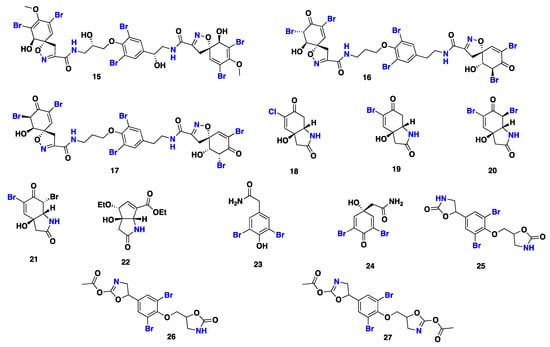 From Figure 2—three complex hexabromotyrosine derivatives containing the oxazolidone moiety, namely fistularin-3 (15) and 11,17-dideoxyagelorins A (16) and B (17), along with 5-chlorocavernicolin (18), 5-bromocavernicolin (19), cavernicolin-1 (20), cavernicolin-2 (21), subereatensin (22), 2-(3’,5’-dibromo-4’-hydroxyphenyl)acetamide (23), 3,5-dibromoverongiaquinol (24), and bis-oxazolidone (25) and its acetate congeners (26 and 27) were reported from the marine sponge S. aff. praetensa collected from the Gulf of Thailand [,,]. Some of these compounds exhibited potent cytotoxicity against five human cancer cell lines: MCF-7 (breast cancer), NCI-H460 (human non-small cell lung cancer), SF268 (glioblastoma), TK-10 (human renal carcinoma), and UACC-62 (human melanoma), with GI50 values in the micromolar range [,,]. Moreover, 15, which was also isolated from Alisina archeri, was shown to inhibit the growth of feline leukemia virus []. In addition to antitumor activity, 24 also displayed antibacterial activity []. Debitus et al. [] found that 24, isolated from S. creba, also exhibited a chloramphenicol antibiotic-like activity (quorum sensing inhibition) against the marine bacterium Vibrio scala. Weiss et al. [] described the isolation of 24 from the marine sponge Verongia aerophoba and its antibacterial activity against eight different Gram-positive or Gram-negative marine bacteria, including Alteromonas, Moraxella, and Vibrio sp., in addition to potent activity against the marine bacterium Photobacterium phosphoreum, with an EC50 value of 3.45 µM. Moreover, this compound also inhibited the growth of the marine microalgae Coscinodiscus wailesii and Prorocentrum minimum, with an EC50 of 5.6 µM [] (Figure 2).