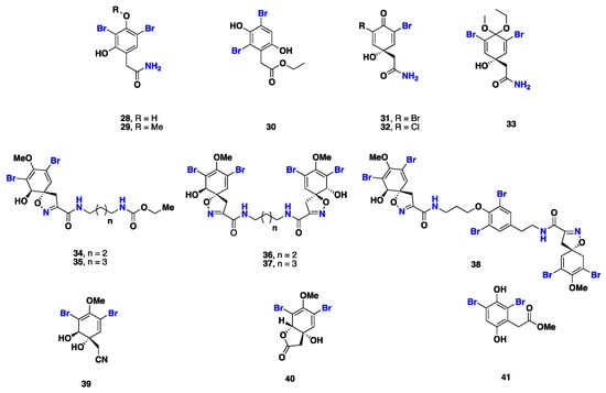From Figure 3—six cytotoxic and antimicrobial dibromophenol derivatives, including subereaphenol A (28), 2-(3’,5’-dibromo-2’-hydroxy-4’-methoxyphenyl) acetamide (29), subereaphenol C (30), dibromoverongiaquinol (31), and bromochloroverongiaquinol (32), were isolated from S. creba [], whereas 32 and 2-(3’,5’-dibromo-4’-ethoxy-1’-hydroxy-4’methoxy-2’,5’-cyclohexadien-1-yl) acetamide (33) were isolated from S. mollis, which was collected from the Egyptian Red Sea []. Compound 32 showed antibacterial activity against both Gram-positive (Sarcina lutea) and Gram-negative (Alcaligena faecalis and Proteus vulgaris) bacteria []. Compounds 23 and 30–32 [] were re-isolated from Suberea sp., also collected from the Red Sea []. Compounds 23, 30 and 32 exhibited cytotoxic and antiproliferative effects against HCT-116 (human colon cancer) and HeLa (human carcinoma) cell lines, and 32 was found to be the most cytotoxic, with IC50 values of 4.5 and 10 µg/mL, respectively. Additionally, 32 also exhibited moderate antibacterial activity against Escherichia coli, with an inhibition zone of 12 mm [].