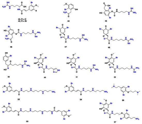 From Figure 4—two antimicrobial brominated arginine derivatives, subereamines A and B (42 and 43), along with subereaphenol D (44), were isolated from S. mollis collected in the Egyptian Red Sea []. The chemical investigation of S. clavata extracts furnished eight guanidine-containing bromotyrosine derivatives, namely clavatadines A–E (45–49), aerophobin-1 (50), purealidin L (51), and aplysinamisine II (52) that showed inhibition against Factor XIa [,]. The antibacterial bromotyrosine alkaloids possessing polyamine motifs, ianthelliformisamines A–C (53–55), were isolated from S. ianthelliformis along with aplysamine-1 (56) and araplysillin-I (57). Compound 53 showed antibacterial activity against the Gram-negative bacterium Pseudomonas aeruginosa, with an IC50 of 6.8 μM [] (Figure 4).